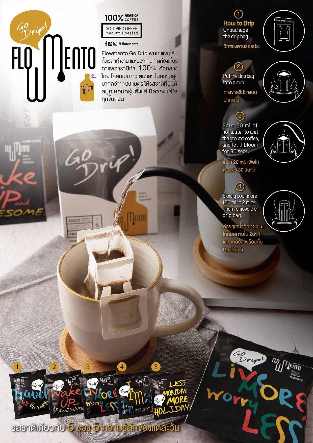 ทุกเช้าที่ตื่น ไม่ง่ายเลยที่จะหากาแฟที่ใช่ในทุกที่ทุกเวลาที่ต้องการ ติด Flowmento Go Drip ไว้ทั้งเวลาทำงาน หรือออกเดินทางท่องเที่ยว กาแฟอาราบิก้า100%